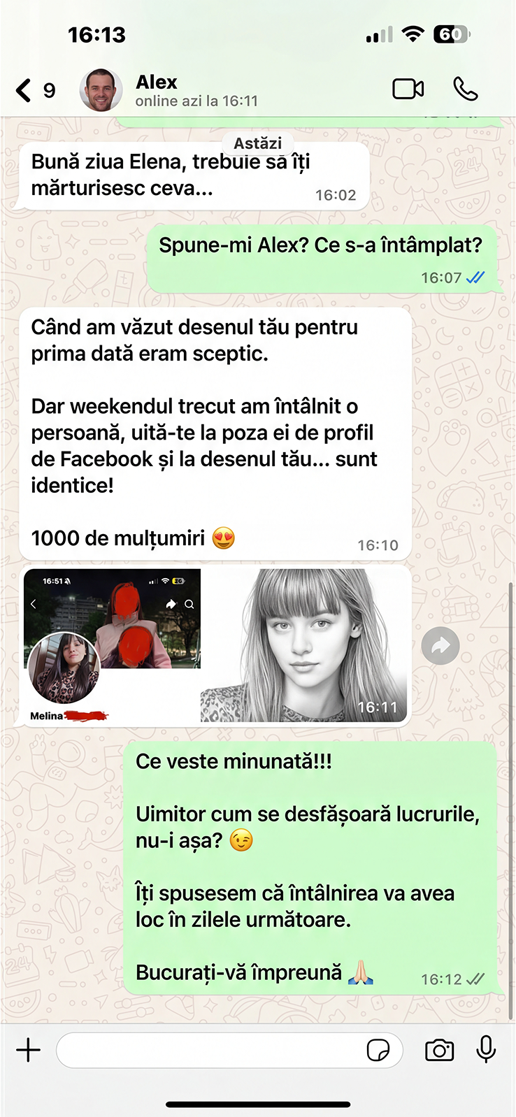 Sunt Elena Stancu, o clarvăzătoare cu un dar unic pe care l-am perfecționat din copilărie. Abilitățile mele au fost cultivate într-o familie profund înrădăcinată în practici spirituale și psihice, și am petrecut ani întregi perfecționându-mi arta. Nu mă limitez doar la a desena; mă conectez la energii și emoții la un nivel care nu este vizibil cu ochiul liber. Această conexiune îmi permite să creez o reprezentare a sufletului tău pereche.
